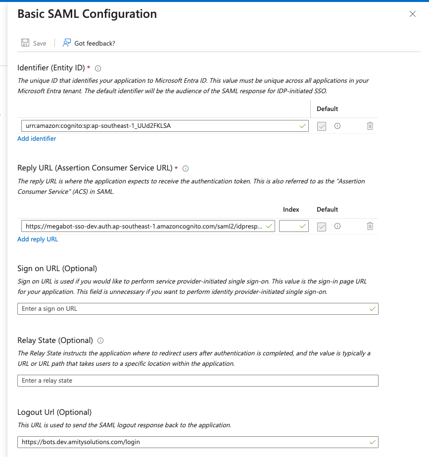 2. Add Reply URL: Enter the URL sent by the ASOL team (format: \`{cognate domain}/saml2/idpresponse\`).