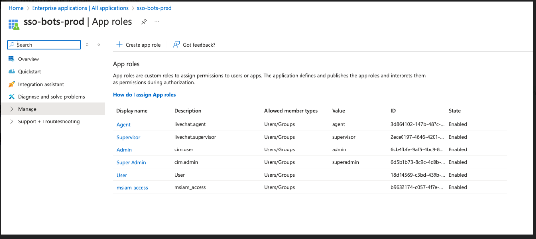 Set up the app roles value and provide the expected [user roles in amity bots plus](https://docs.amitysolutions.com/amity-solutions/amity-bots-platform/users#user-roles-and-permissions) to ASOL team